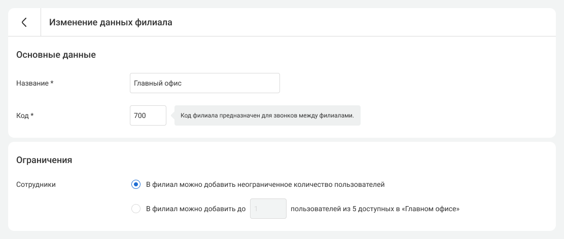 2. Далее откроются те же разделы, которые появляются при создании филиала. Вы можете поменять название и код филиала, выставить ограничения по сотрудникам, добавить или убрать номера и настроить доступы.