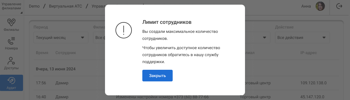 При попытке добавить нового сотрудника сверх лимита вы увидите следующее предупреждение на домене.