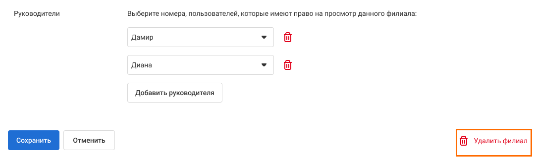 Если нужно будет удалить филиал, нажмите на корзину внизу той же страницы.
