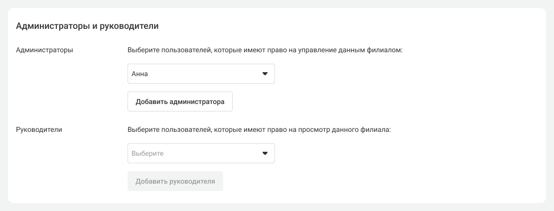 5. Настройте доступы к филиалу. Вы можете добавить новых администраторов и руководителей из сотрудников с логином АТС.