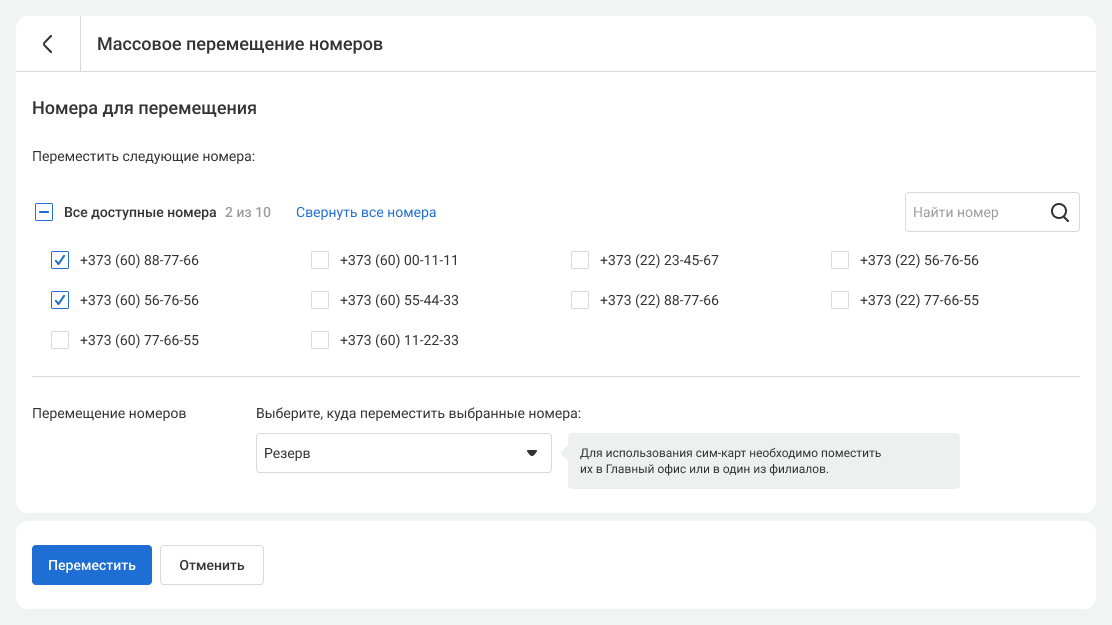 В разделе «Номера» можно перенести сразу несколько номеров в один филиал или в резерв. Чтобы это сделать, выполните следующие шаги: