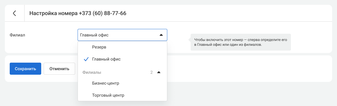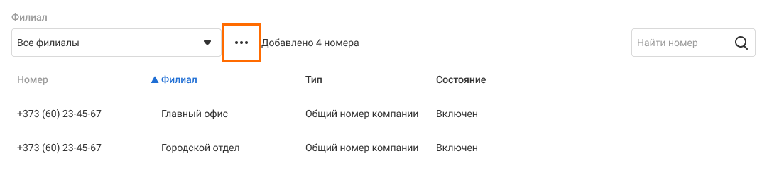 • Состояние – выключен или включен. Номер можно выключить в настройках номеров внутри филиала или в кабинете управления филиалами, если добавить его в резерв.