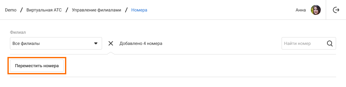 4. Нажмите на кнопку «Переместить». Теперь выбранные номера относятся к указанному филиалу.