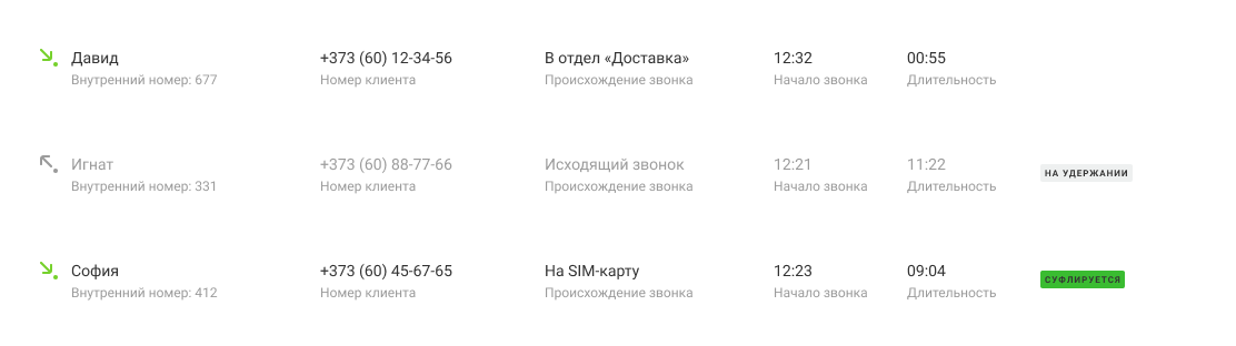 В ВАТС видны все активные звонки компании. Во вкладке «Суфлирование» по каждому вызову отображается время начала разговора и его длительность. Иконка наушников справа показывает, что к вызову можно подключиться. Также здесь отображается происхождение каждого звонка — исходящий он или входящий. Про входящие звонки можно узнать, куда именно позвонил клиент.