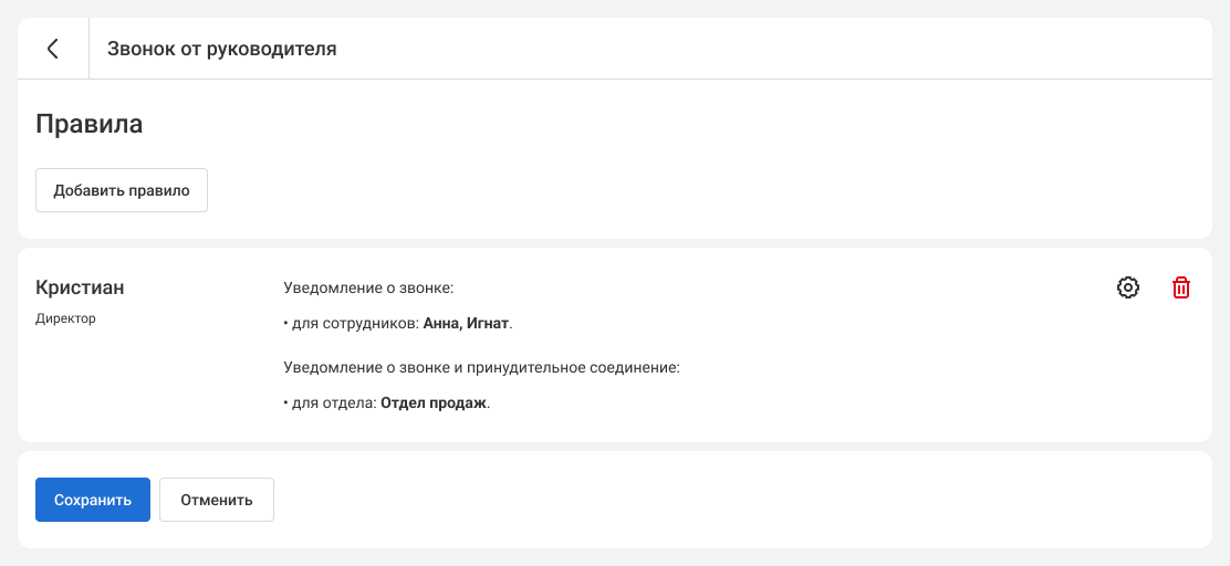 Готово! Теперь руководитель сможет в любой момент дозваниваться до выбранных в правило сотрудников и отделов.