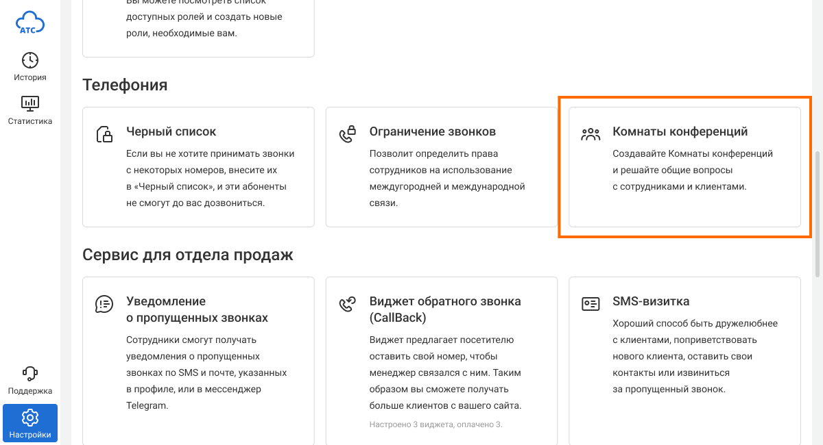 1. В настройках Виртуальной АТС нажмите кнопку «Еще», и в разделе «Телефония» кликните на «Комнаты конференций».