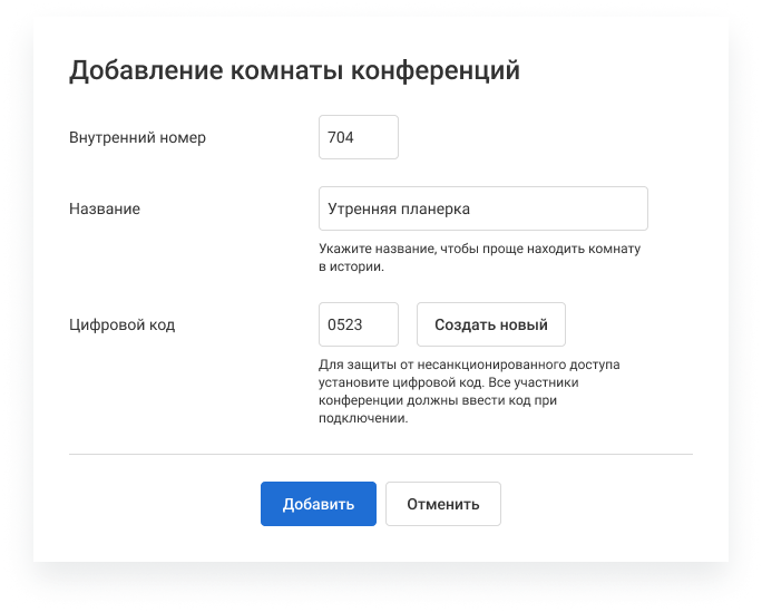 3. Придумайте название конференции и внутренний номер (адрес) комнаты. Он поможет участникам быстро присоединиться к встрече.