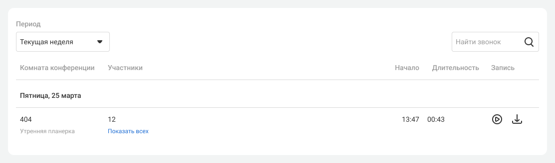 Найти нужную конференцию можно по названию комнаты и дате, а также отфильтровав список конференций по имени участника или номеру телефона. Вы можете не только прослушать запись конференции, но и скачать ее, чтобы отправить коллегам.