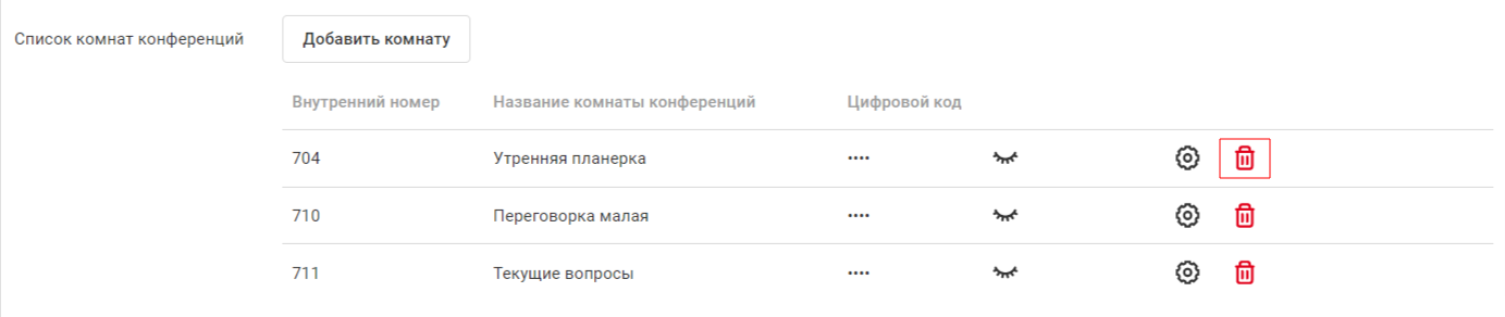 Если комната конференций вам больше не нужна, найдите ее в списке комнат и нажмите на «корзину» справа.