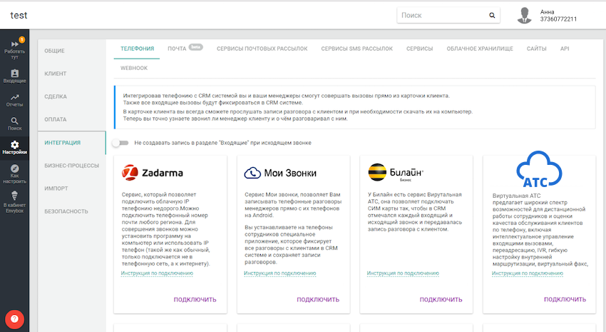Интеграция EnvyCRM и Виртуальной АТС