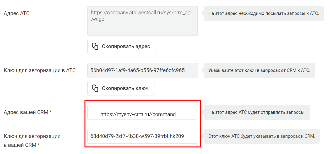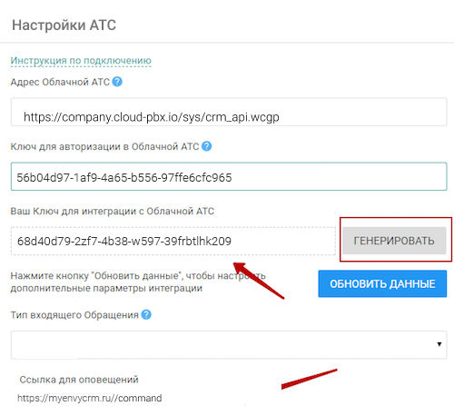 Далее в настройках CRM-системы нажмите «Генерировать», скопируйте сгенерированный ключ и вставьте его в поле «Ключ для авторизации в вашей CRM» в личном кабинете Виртуальной АТС.