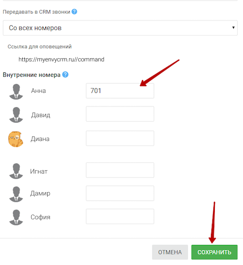 Вернитесь в настройки CRM-системы, укажите внутренние номера сотрудников и нажмите кнопку «Сохранить». На этом интеграция с Виртуальной АТС будет завершена.