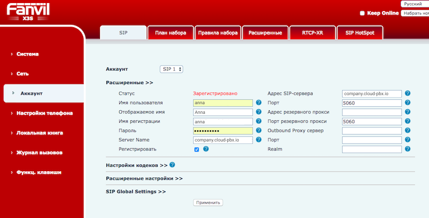 - Адрес SIP-сервера — имя вашей Виртуальной АТС.