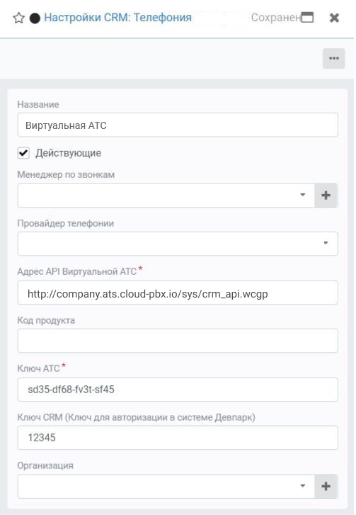 - Ключ CRM (Ключ для авторизации в системе Девпарк): ранее придуманный пароль, который вы указали в ОАТС в поле «Ключ для авторизации в вашей CRM».