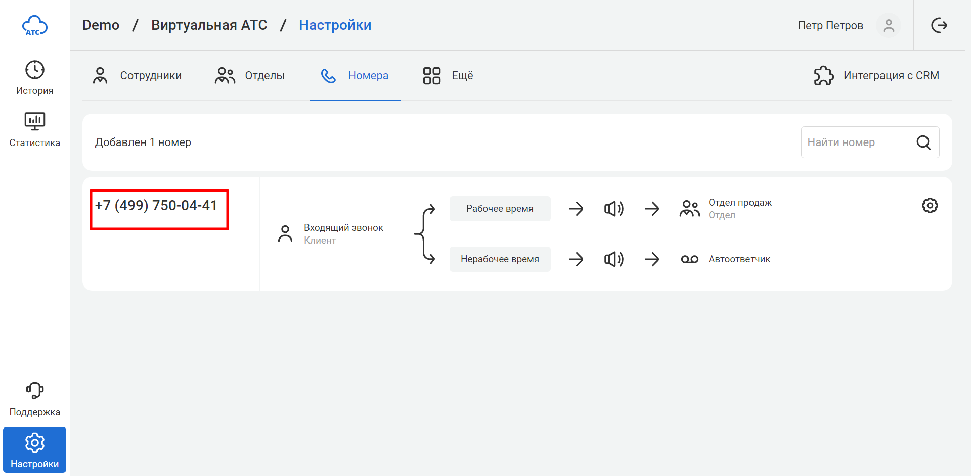 Выберите раздел «Управление и отчетность« — «Администрирование» — «Рабочие места». В настройках рабочих мест нужно указать номера телефонов в формате +79991112233 и внутренние номера сотрудников.
