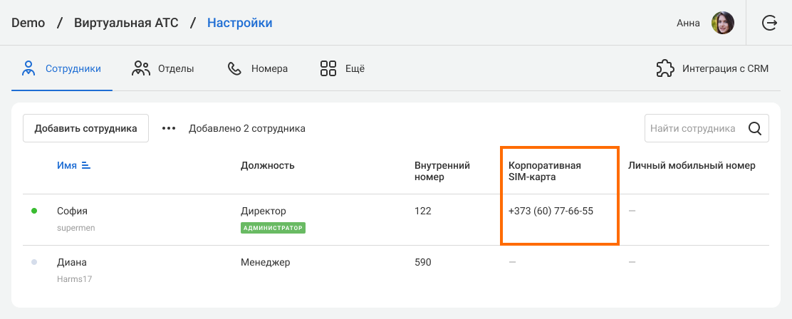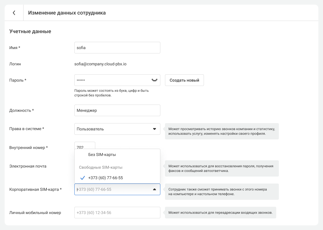 Назначить корпоративную SIM-карту сотруднику может только пользователь с уровнем прав «Администратор». После этого Корпоративная SIM-карта сразу станет персональным номером сотрудника в АТС.