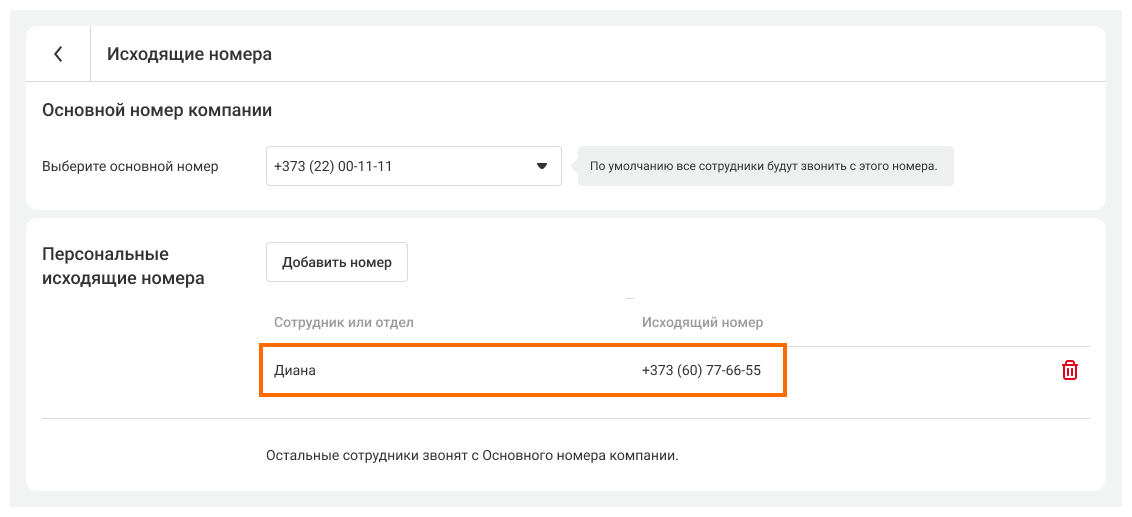 Зайдите во вкладку «Ещё» → «Исходящие номера» и удалите настройку персонального исходящего номера для сотрудника. Для этого нажмите на красную корзину справа от настроек исходящего номера в подразделе «Персональные исходящие номера». Затем нажмите на кнопку «Сохранить настройки» внизу страницы.