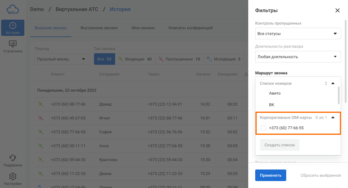 В Истории и Статистике все входящие звонки на номер корпоративной SIM-карты можно посмотреть отдельно от остальных звонков. В фильтре «Через номер» корпоративные SIM-карты сгруппированы отдельном блоке. Этот блок располагается ниже, чем списки номеров и общие номера компании. Выберите в фильтре нужный вам номер и укажите тип звонка «Входящие».