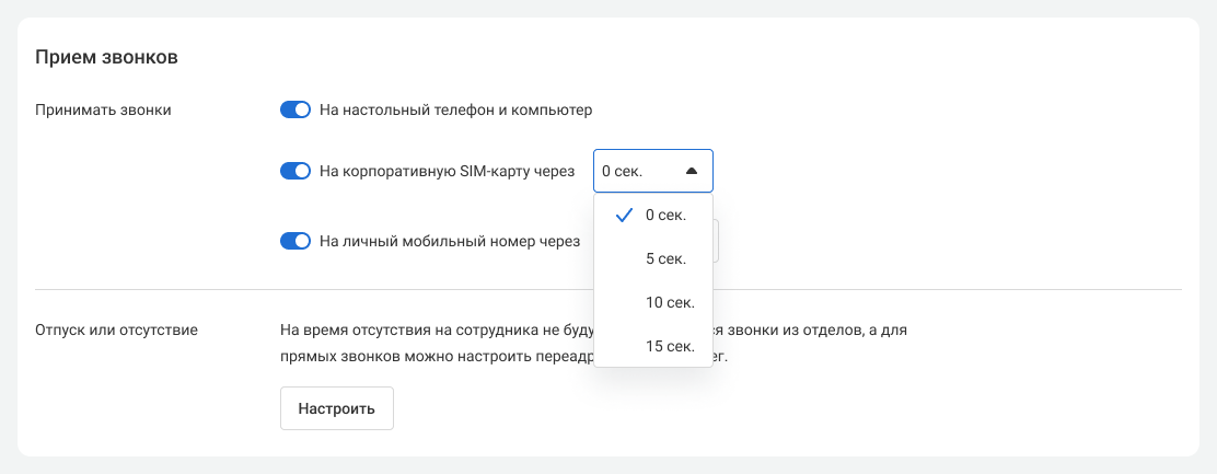 3. При выборе Корпоративной SIM-карты на ней будет автоматически запущен прием звонков — переключатель в разделе «Прием звонков» сам перейдет в активное положение. Если хотите, чтобы звонок последовательно поступал сотруднику на настольный телефон, а затем на Корпоративную SIM-карту, настройте задержку при переадресации звонка.