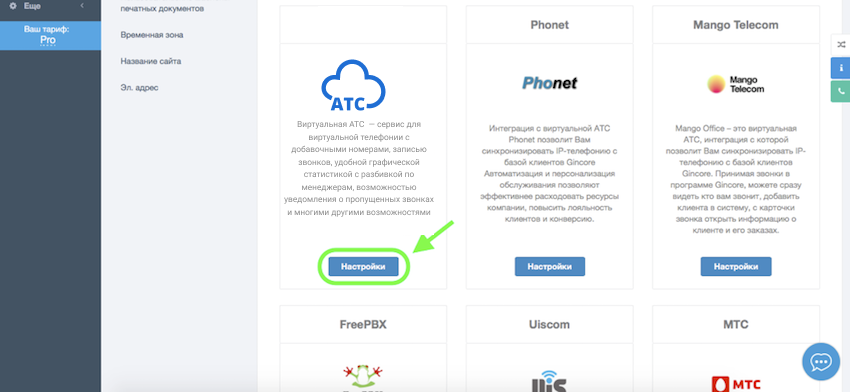 3. Зайдите в Gincore. Выберите «Еще» — «Настройки» — «Интеграция с телефонией». Нажмите кнопку «Настроить» на карточке Облачная АТС.
