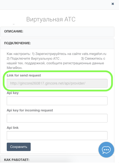 5. Скопируйте значения поля «Link for send request» (название вашего сервиса.gincore.net/api/provider/cloud-pbx).