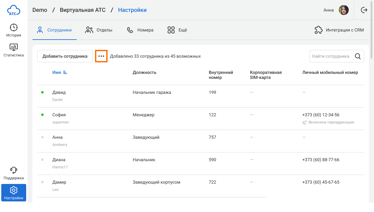 • массово создать или отредактировать сотрудников. Если вам нужно добавить ваши номера, изучите раздел «Номера».