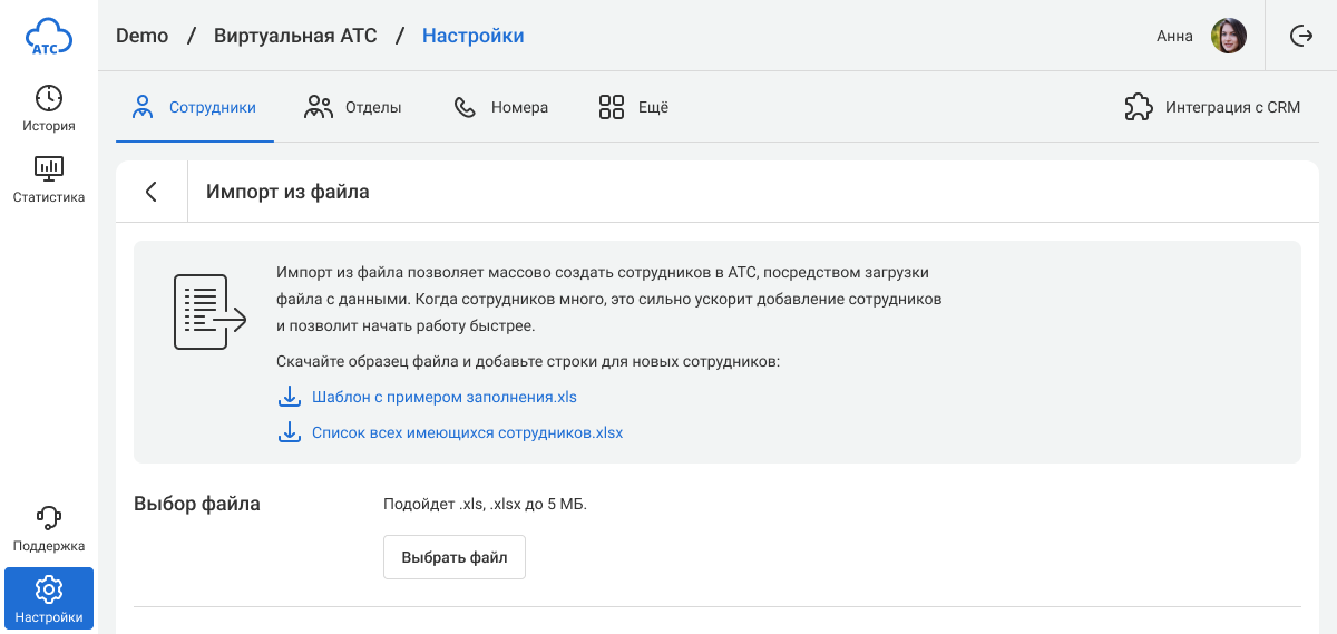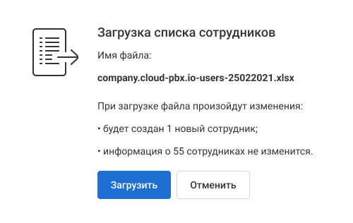 Вернитесь в интерфейс АТС и загрузите файл. Если система обнаружит какие-то ошибки, она сообщит вам об этом. Подтвердите создание или изменение сотрудников, кликнув на кнопку «Загрузить».