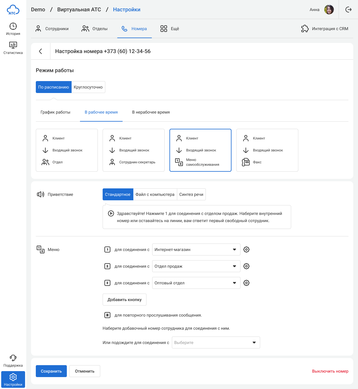 Голосовое меню настраивается отдельно для каждого номера. Перейдите в раздел «Номера» и выберите номер, на котором хотите настроить голосовое меню. Затем выберите режим работы номера и направьте входящие звонки на «Меню самообслуживания».