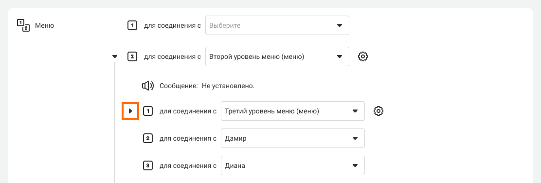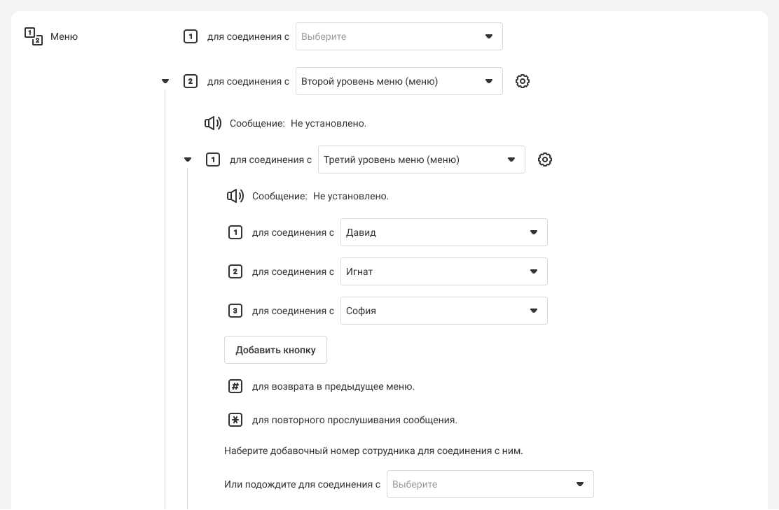 Когда вы снова выберете в раскрывающемся списке, например, «Третий уровень», то откроются все настройки этого уровня — голосовое приветствие, распределение кнопок и вложенные в него уровни.
