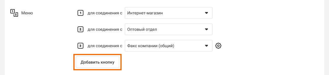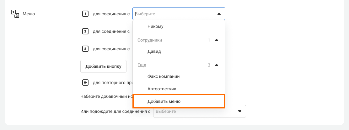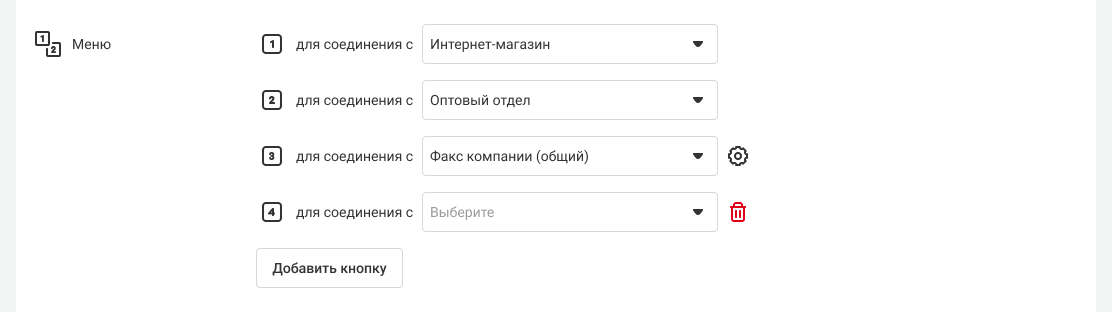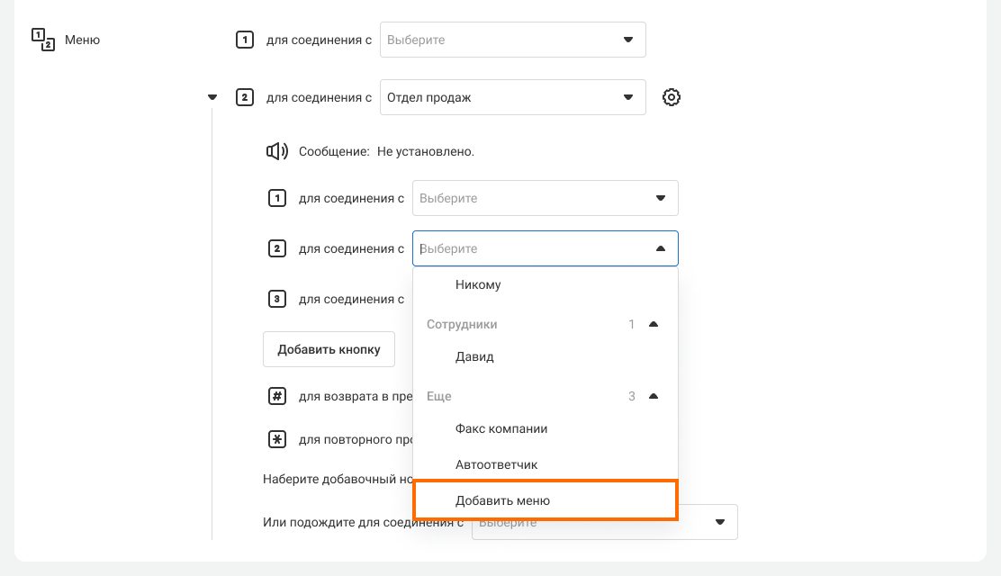 1. Чтобы настроить первый уровень меню, укажите, куда направится вызов при нажатии каждой из кнопок. Так, если вы хотите, чтобы при нажатии кнопки «1» клиенту ответил отдел продаж, откройте раскрывающийся список рядом с текстом «1 для соединения с …» и выберите в нем «Отдел продаж».