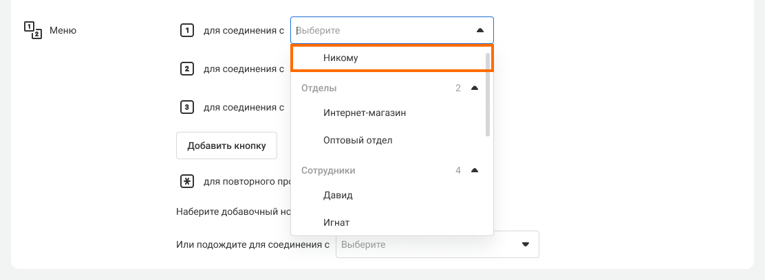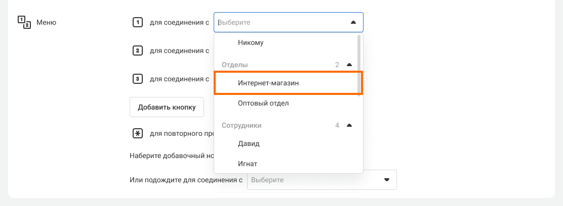 2. Таким же образом выберите, каким отделам или сотрудникам будет поступать звонок при нажатии цифр 2 и 3.