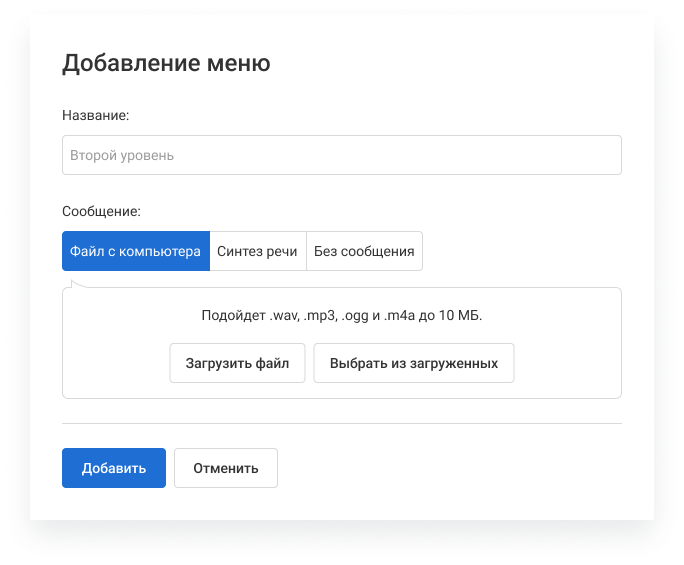 4. Голосовое приветствие настраивается отдельно для каждого уровня меню. Выберите приветствие для второго уровня меню и нажмите «Добавить».