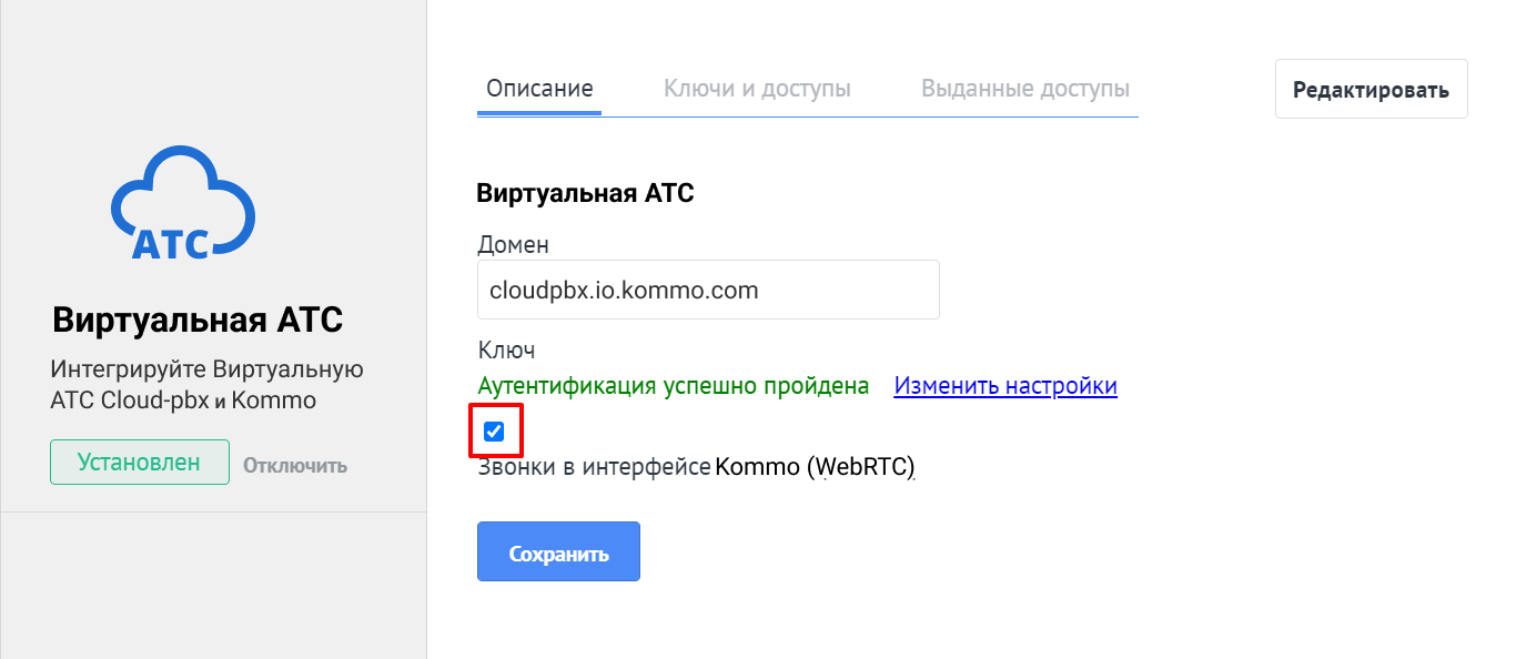 В Kommo зайдите в раздел «Настройки» — «Интеграции» — «Виртуальная АТС», поставьте галочку около «Звонки из Kommo» и сохраните настройки.