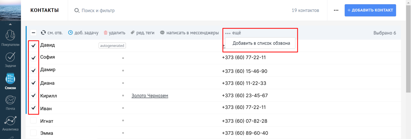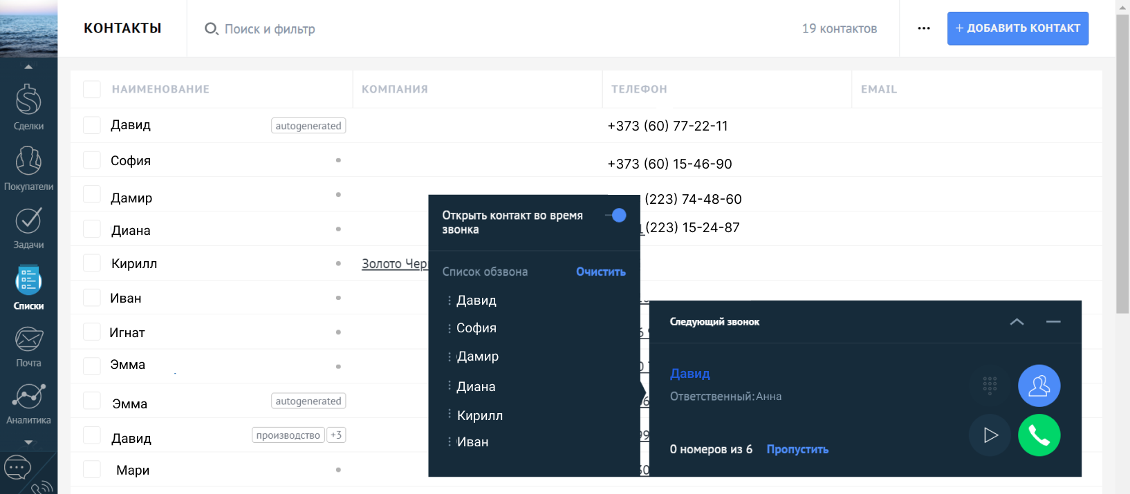 Если менеджеру необходимо позвонить большому количеству клиентов, он может сэкономить время, создав в Kommo список контактов для обзвона и запустив его через виджет.