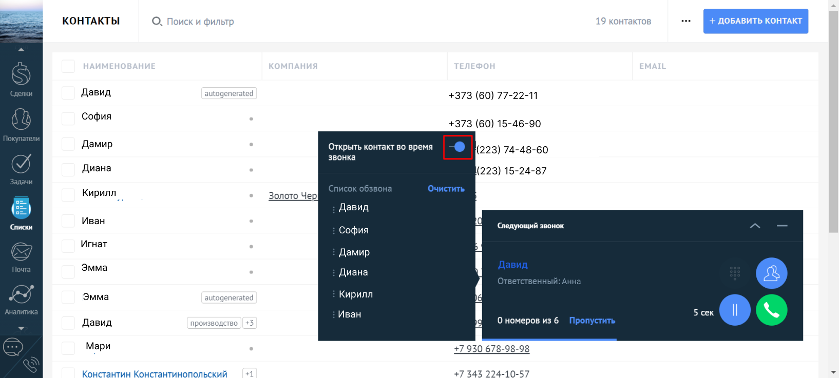 Виджет позволяет гибко управлять списком контактов для обзвона – менять местами контакты, автоматически открывать карточку клиента, которому осуществляется дозвон, и т.д.