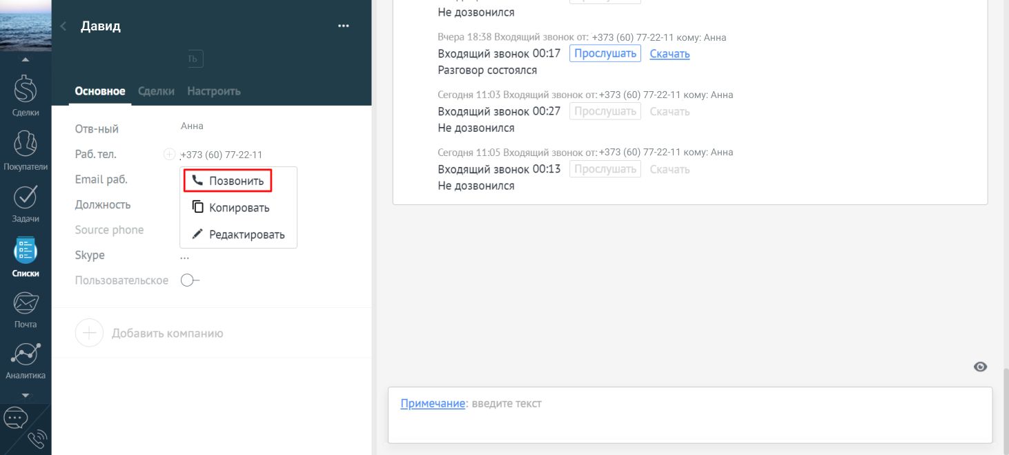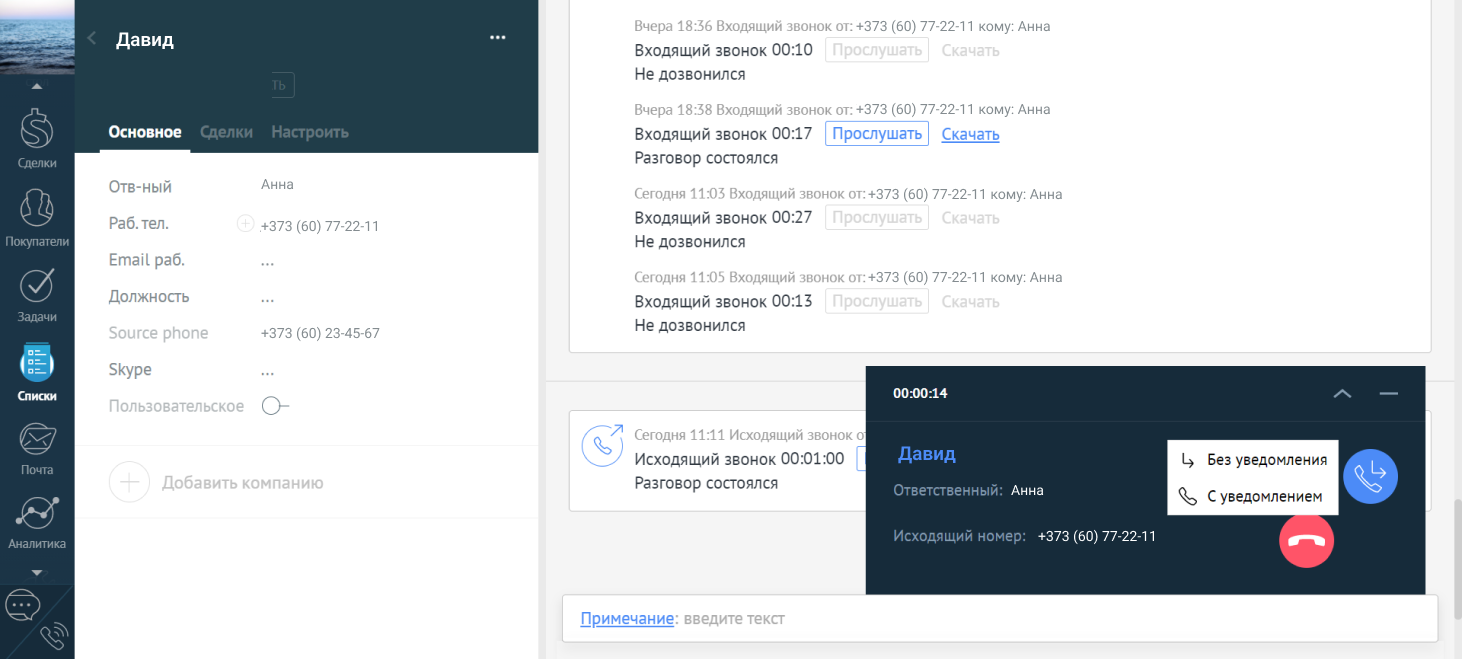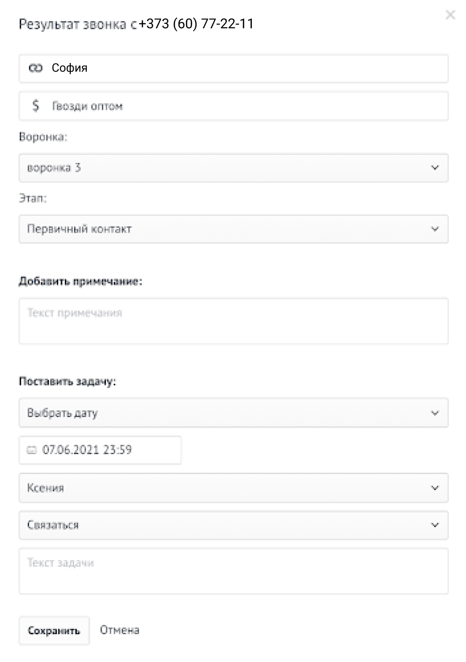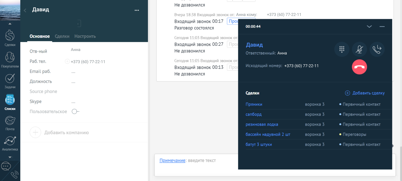 - создать новую сделку по результатам звонка (она будет связана с выбранным контактом),