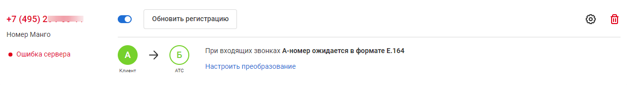 Также в настройках номера будет раздел «При входящих звонках А-номер ожидается в формате E.164». Это техническая информация и, чаще всего, сюда вносить изменения не требуется. Если ваш оператор связи работает не по стандарту E.164, здесь вы сможете настроить преобразование.