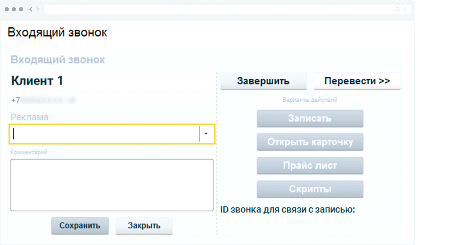 При входящем звонке оператор видит всплывающее окно с карточкой клиента, в которой можно открыть прайс лист, записать пациента на прием и увидеть скрипты разговора.