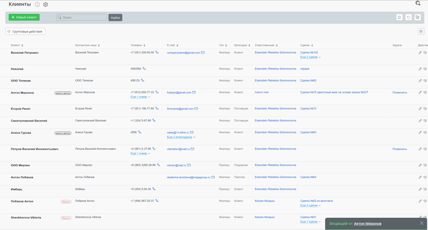 При входящем звонке ваш менеджер увидит имя клиента в правом нижнем углу MegaCRM.