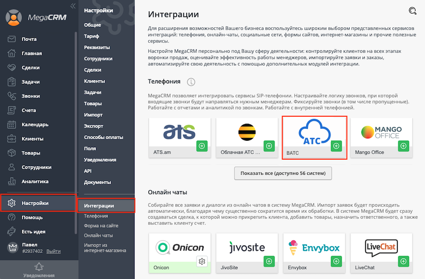 3. В личном кабинете MegaCRM перейдите в раздел “Настройки“ - “Интеграции“ – «Виртуальная АТС».