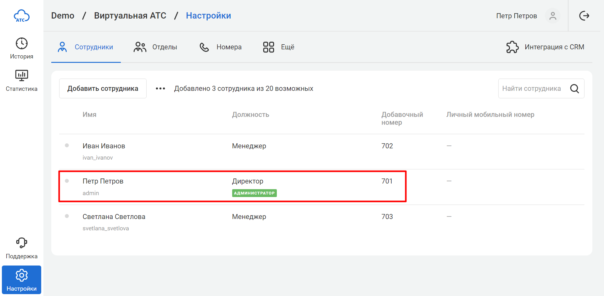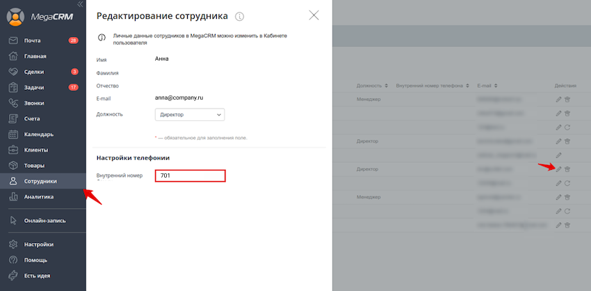 Далее зайдите в ВАТС в раздел «Настройки» → «Сотрудники» и сопоставьте внутренние номера сотрудников с внутренними номерами сотрудников на стороне MegaCRM.