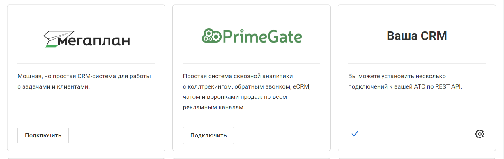 1. В настройках Виртуальной АТС зайдите в раздел “Интеграция с CRM”, пролистайте вниз и найдите карточку «Ваша CRM».