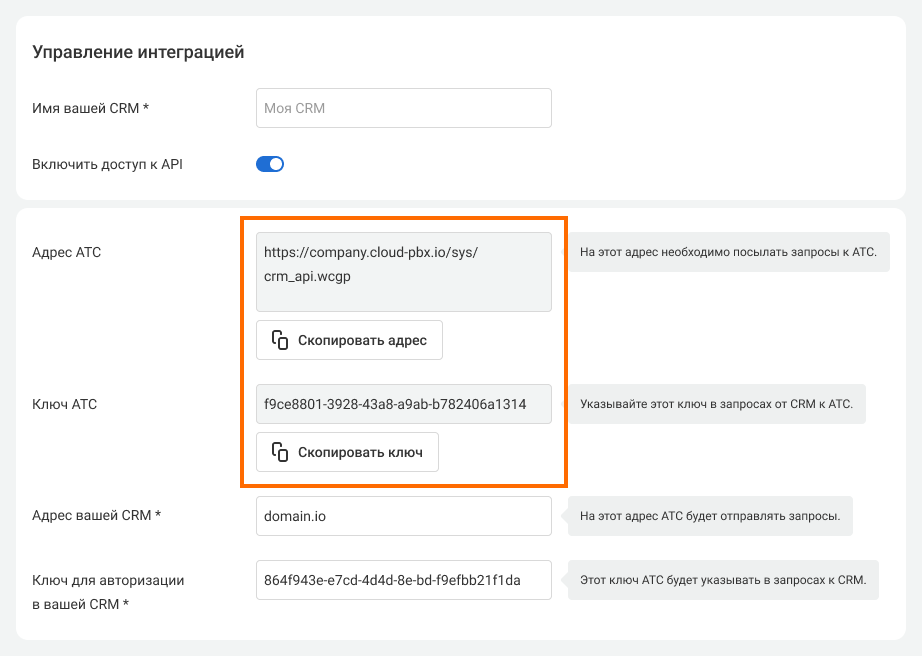 5. Введите скопированные данные в поля “Ключ для авторизации в вашей CRM“ и “Адрес вашей CRM“ в Виртуальной АТС. Нажмите «Сохранить».