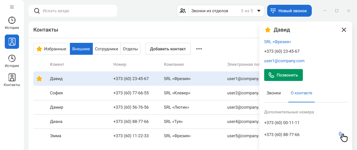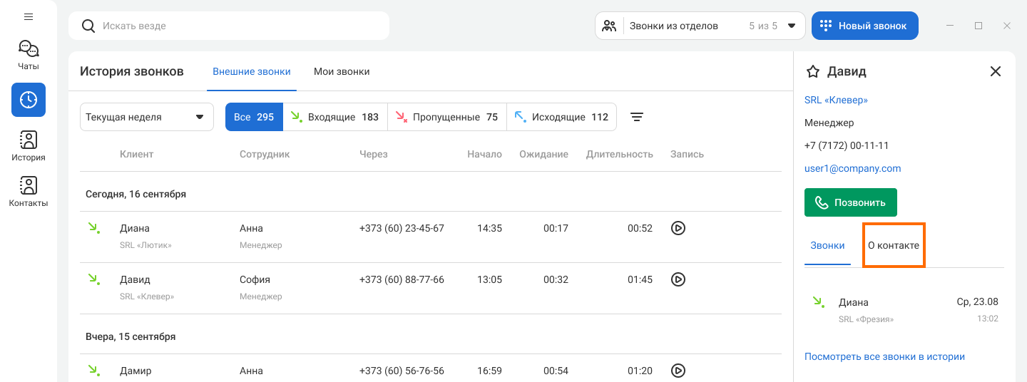 Если у клиента несколько номеров, также из карточки контакта вы можете позвонить на его дополнительный номер. Для этого в карточке перейдите на вкладку «О контакте».
