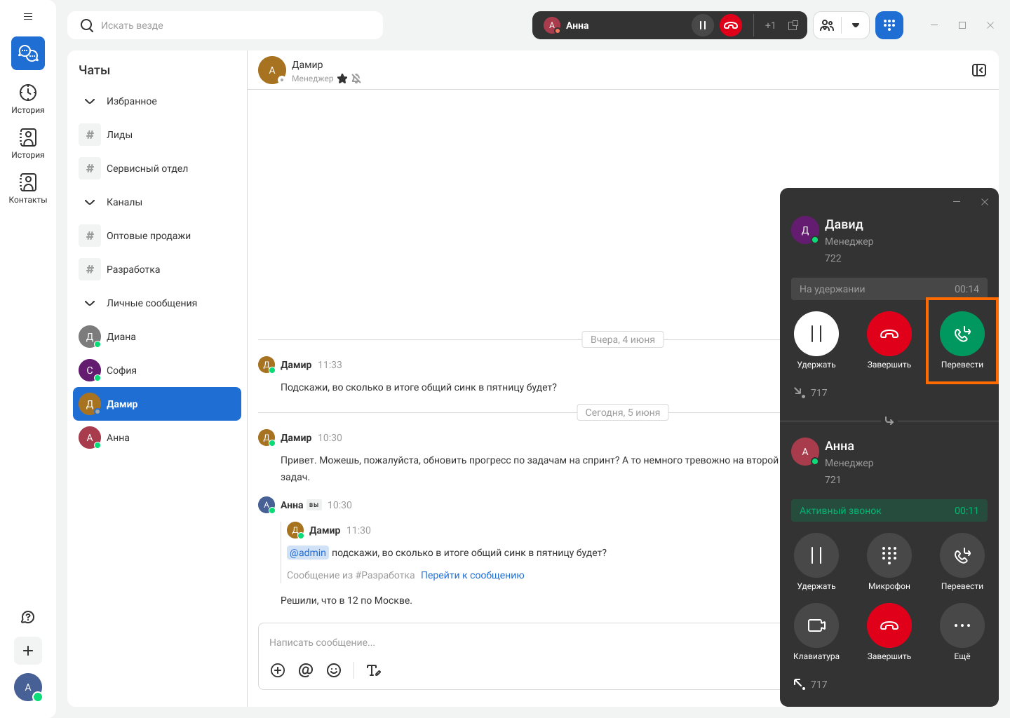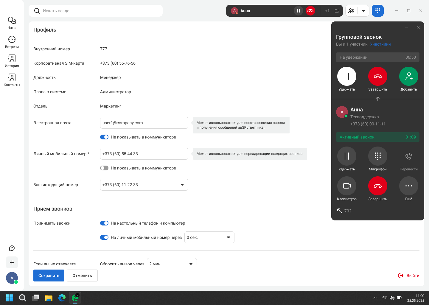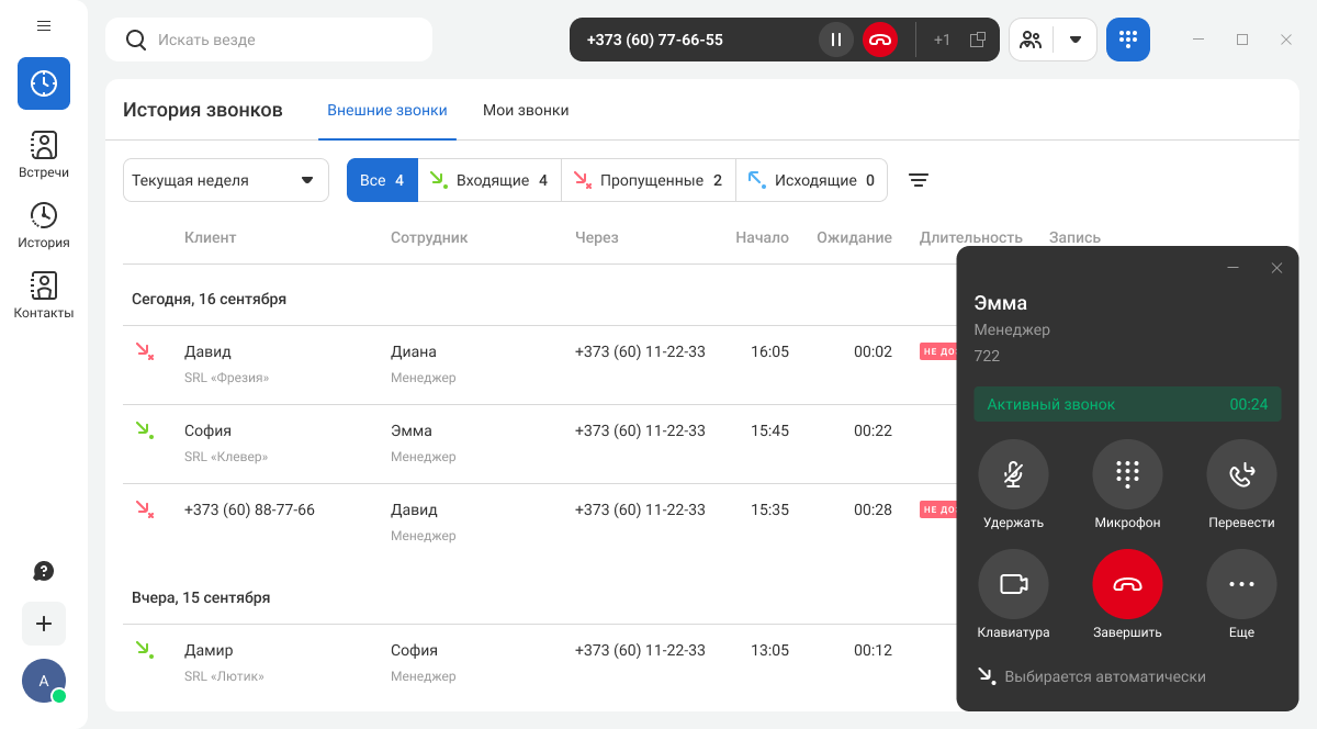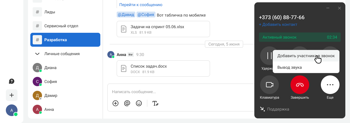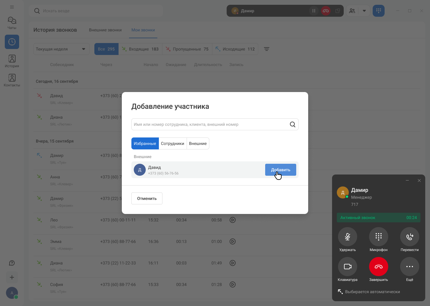 Карточка вызова открывается в отдельном окне, не мешая вам работать с другими приложениями. В карточке звонка доступны все основные функции: удержание, перевод, отключение микрофона, добавление участников в звонок.