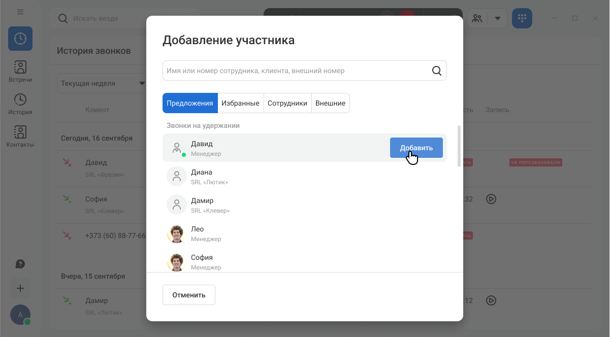 Если у вас есть параллельные вызовы, то при попытке перевода или добавления участников в звонок, они отобразятся на вкладке «Предложения» — так удобнее переключаться между несколькими звонками.
