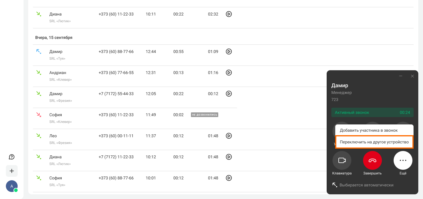 Иногда во время разговора в мессенджере вам нужно покинуть офис. В таком случае можно незаметно для клиента переключить звонок на другое устройство (Call Flip):
