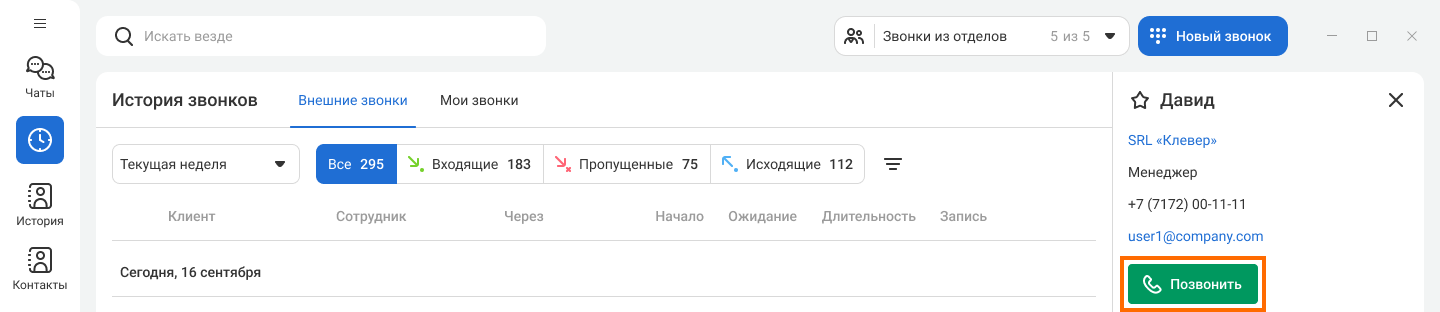 Если у вас пропущенный от клиента и нужно перезвонить как можно скорее, в истории звонков наведите курсор на нужный вызов и нажмите на кнопку «Позвонить» в правой части экрана.
