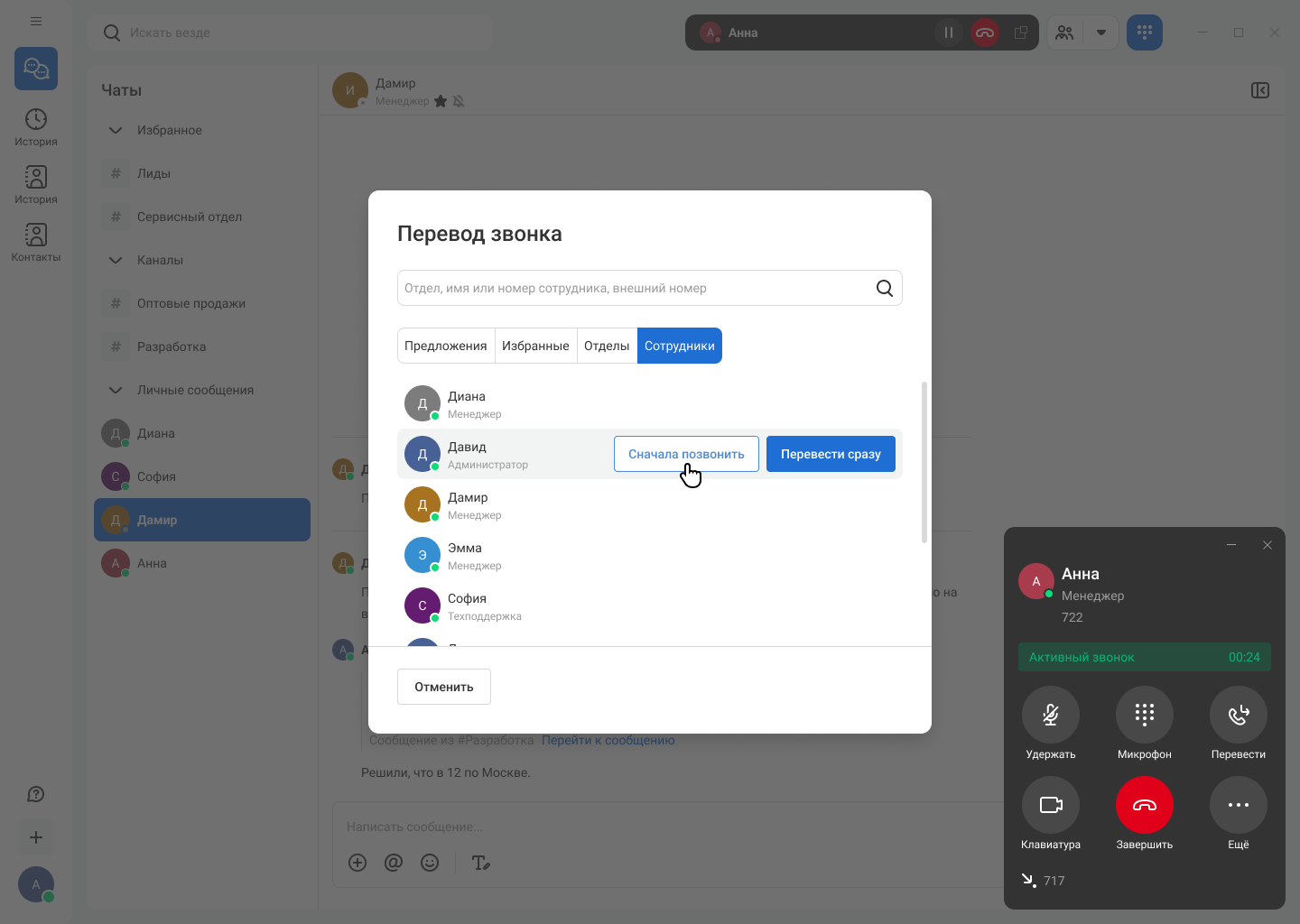 Чтобы перевести вызов, нажмите на кнопку «Перевести» в карточке звонка. Появится окно с вкладками «Отделы» и «Сотрудники». На вкладке «Сотрудники» можно выбрать способ перевода — перевести сразу или сначала позвонить.