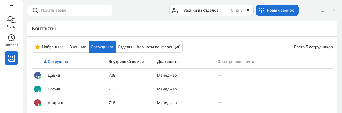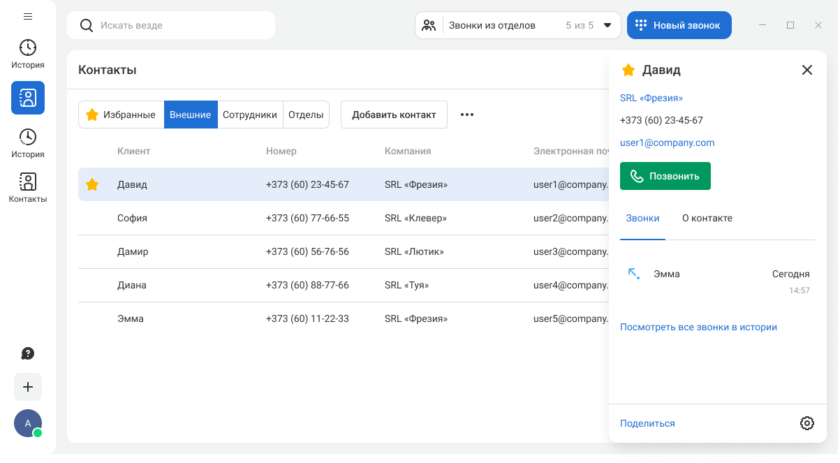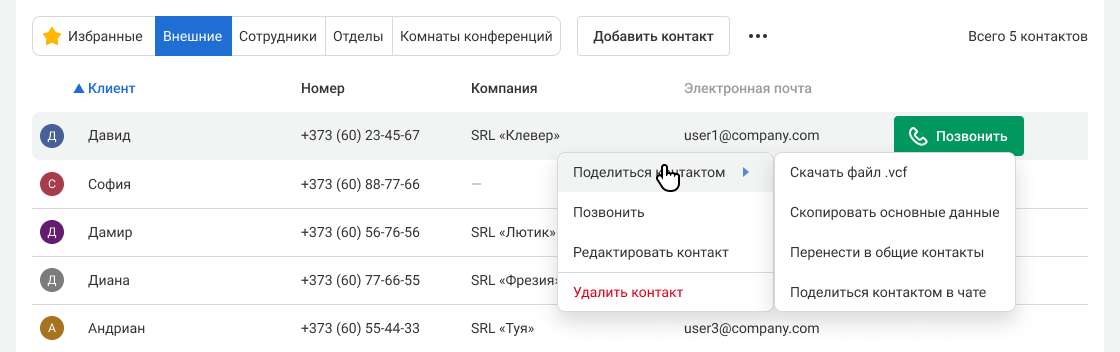 В Корпоративном мессенджере отображаются контакты клиентов и сотрудников. При регистрации сотрудника в АТС его контакт автоматически появляется у всех коллег. Контакты клиентов можно добавлять в мессенджер напрямую, они также доступны всем сотрудникам и синхронизируются с АТС.